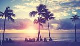 Caribbean tropical beach with coconut palm trees silhouettes at sunset, color toning applied, Mexico.