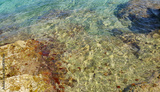 Algae on stones and a transparent sea water near the shore