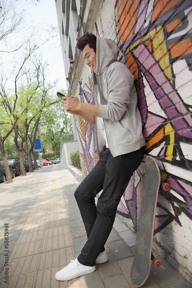 Young man leaning again a wall covered in graffiti and texting on his phone, skateboard is next to him
