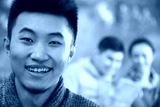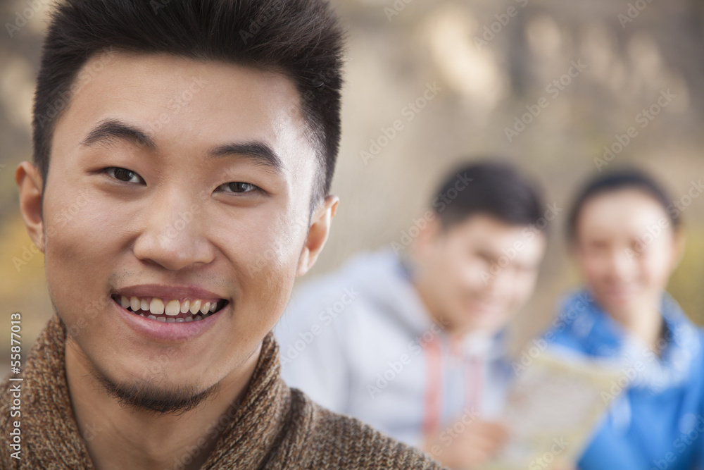 Young man looking at the camera, friends looking at the map on the background, portrait
