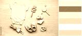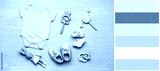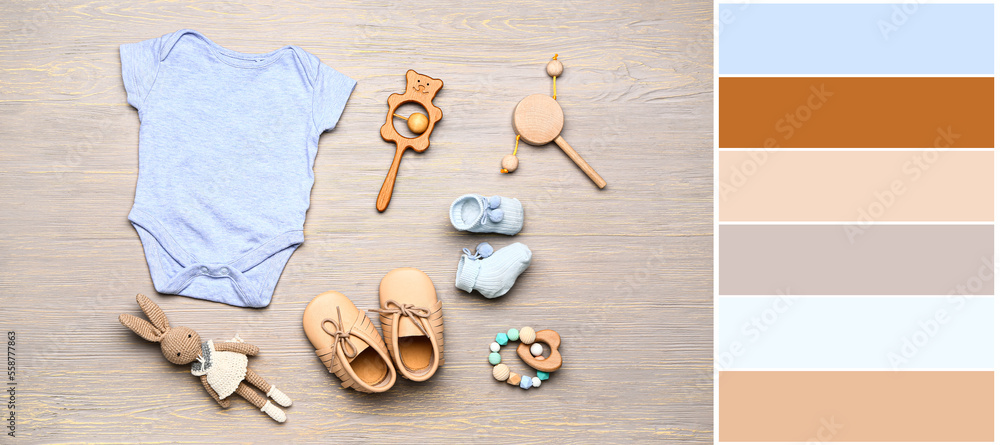 Stylish baby clothes and toys on wooden background. Different color patterns