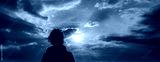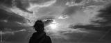 panorama woman head looking at sun breaking through clouds at sunset