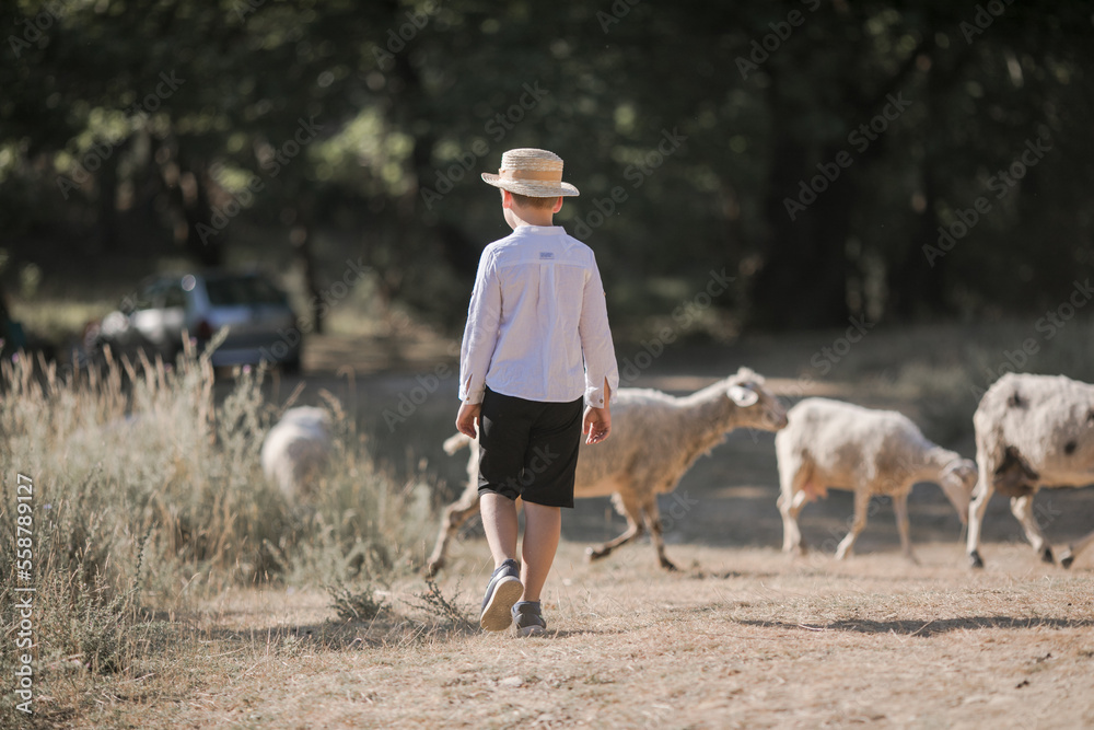Rear on Caucasian small teen boy in hat walking outdoor in field and looking after sheep