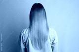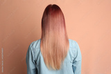 Woman with bright dyed hair on pale pink background, back view