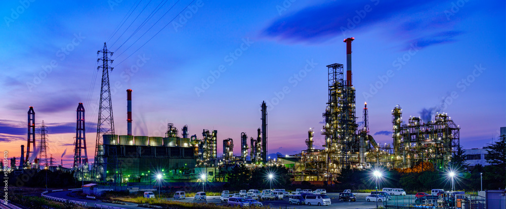 The petrochemical complex at Yokkaichi Port, Yokkaichi city, Mie prefecture, Japan at magic hour.
