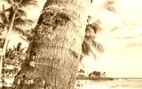 Close up of a coconut palm tree trunk at a tropical beach, selective focus.