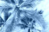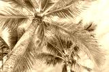 Coconut palm trees against the sky, bottom view, Yucatan Peninsula, Mexico.