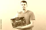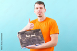 A man holding an opened dirty and dusty laptop shows his thumb up on a blue background. Grimy. Untidy. Careless. Cleaner. Specialist. Clogged. Sweep. Hand. Arm. Holding. Cleaning. Open. Upgrade. Good