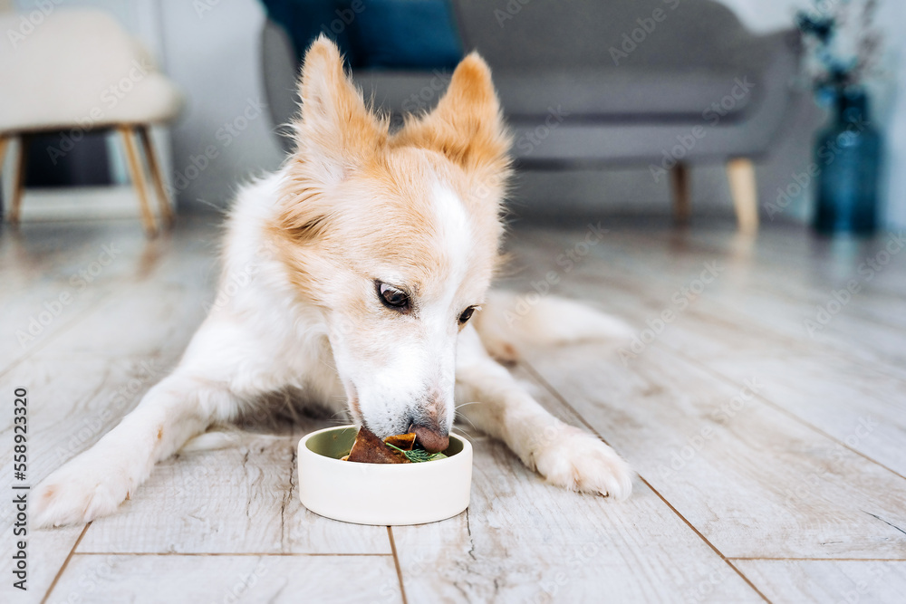 The border collie dog lies in the apartment and eats natural meat food.
