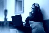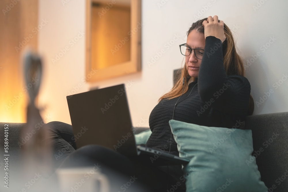 Worried woman with hand on head sitting on sofa in her living room and looking at laptop
