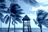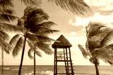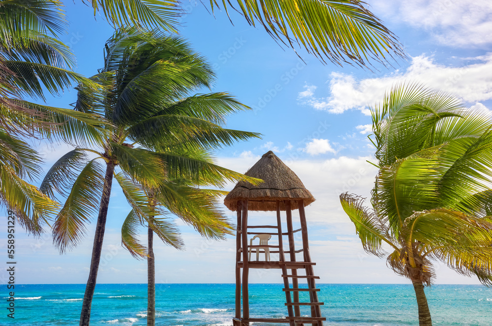 Coconut palm trees and a lifeguard tower on a Caribbean beach.