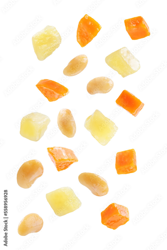 Potato carrot white bean soup with meat sausages in a bowl on a white isolated background