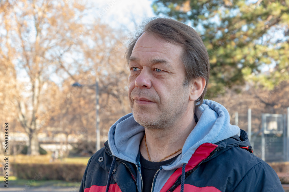An elderly man 45-50 years old in a jacket on a blurry urban background, close-up.