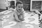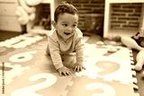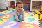 Adorable hispanic baby crawling on floor at kindergarten
