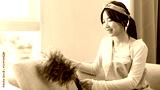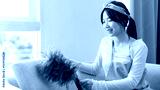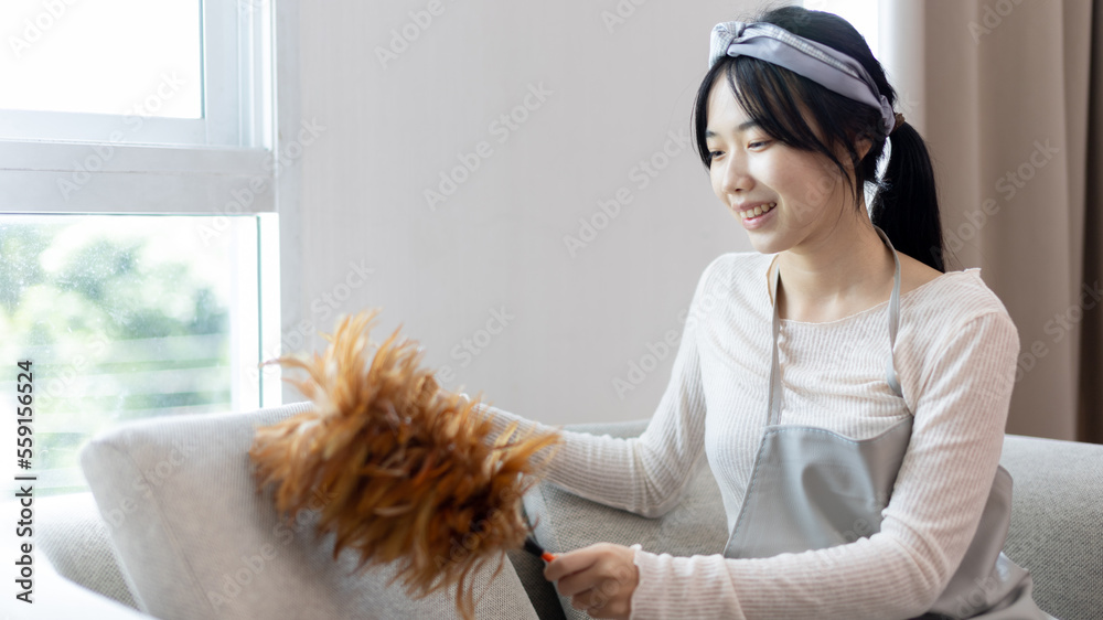 Housewife holding a dusting brush to clean things Pillows, rugs and other things..in the living room, Big cleaning, Daily routine ,Removes germs and dirt and deep stains, Spray alcohol.