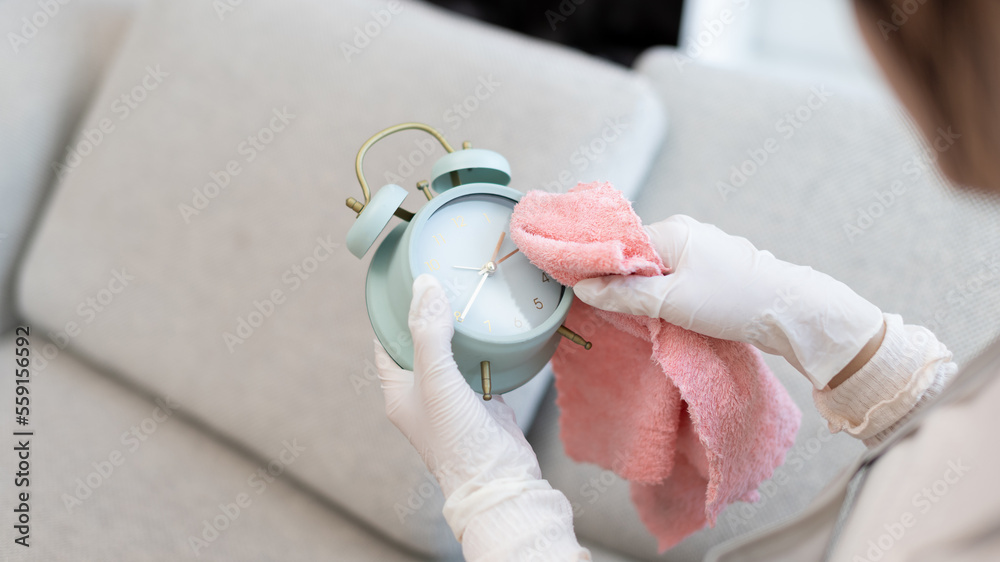 Housewives use towels to wipe things, tables, chairs, display cabinets and glass inside the house,, Big cleaning, Housework, Daily routine ,Removes germs and dirt and deep stains, Spray alcohol.