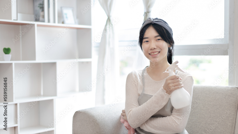Young housewife holding a spray bottle to clean things in the living room, Big cleaning, Housework, Daily routine ,Removes germs and dirt and deep stains, Spray alcohol, Clean up.