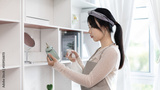 Young housewife holding a spray bottle to clean things in the living room, Big cleaning, Housework, Daily routine ,Removes germs and dirt and deep stains, Spray alcohol, Clean up.