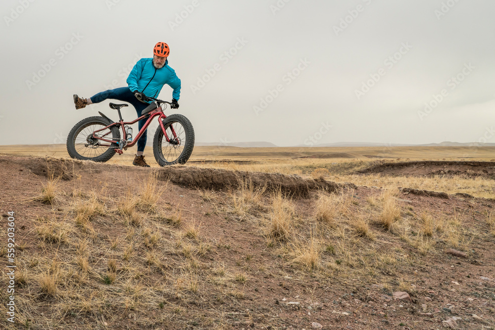 senior male cyclist with a fat mountain bike on a single track trail in northern Colorado grassland, early spring scenery in Soapstone Prairie Natural Area near Fort Collins