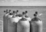 Close up picture of scuba tanks with turquoise water in the background, selective focus.