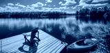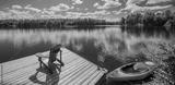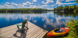 Chair sitting on a wood dock facing a calm lake with a red canoe