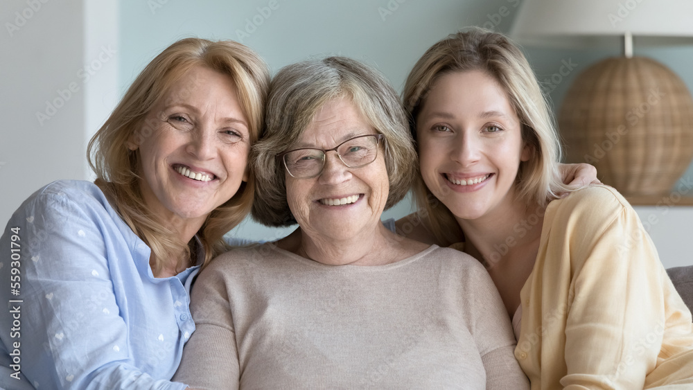 Cheerful pretty women of different ages, generations sitting close together, looking at camera, smiling, enjoying family relationships, meeting at home, leisure, mothers day