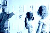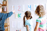 Children stand with back and learn english letters, alphabet and numbers on cards on wall. Kids point at colored numbers on sheets of paper by finger. Reading and counting, study in daycare centre