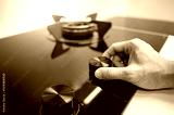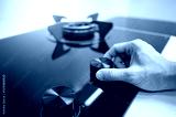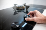 Male hand turning switch knob on modern gas stove in kitchen showroom. Cooking appliance in domestic kitchen. Home improvement and House interior design concepts