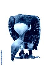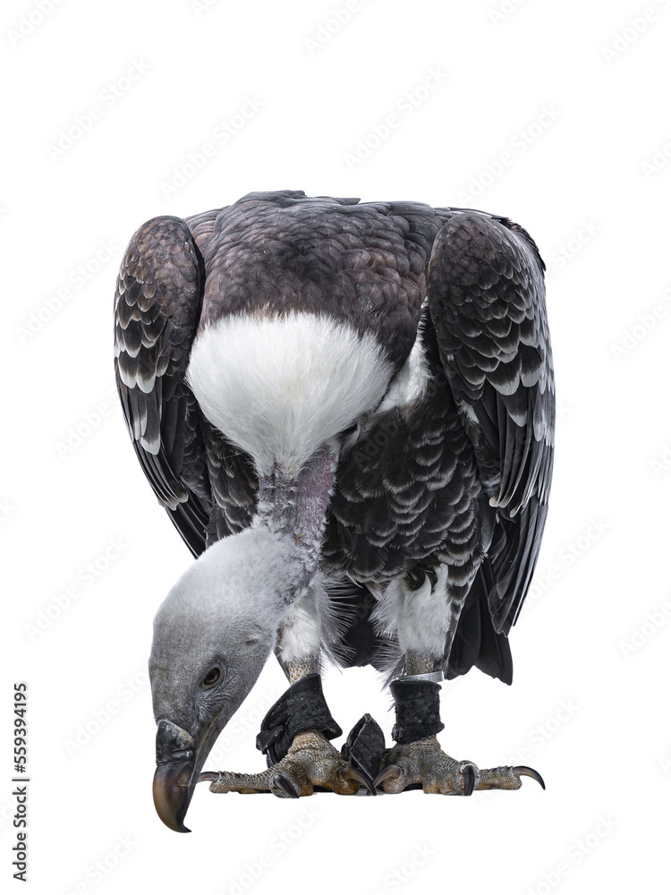Young adult Rüppell's griffin vulture sitting full body facing front. Head completely down and also looking down. Isolated cutout on transparent background.