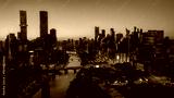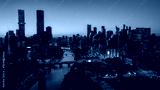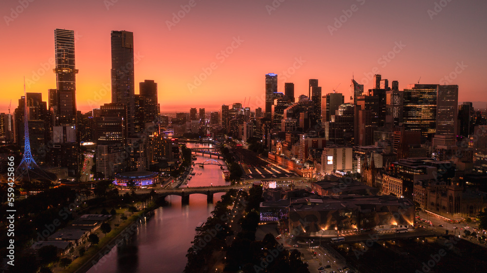 Melbourne City Skyline Panoramic View at sunset. The sky has blue, purple and orange layered hues with orange reflections of the facades of buildings.