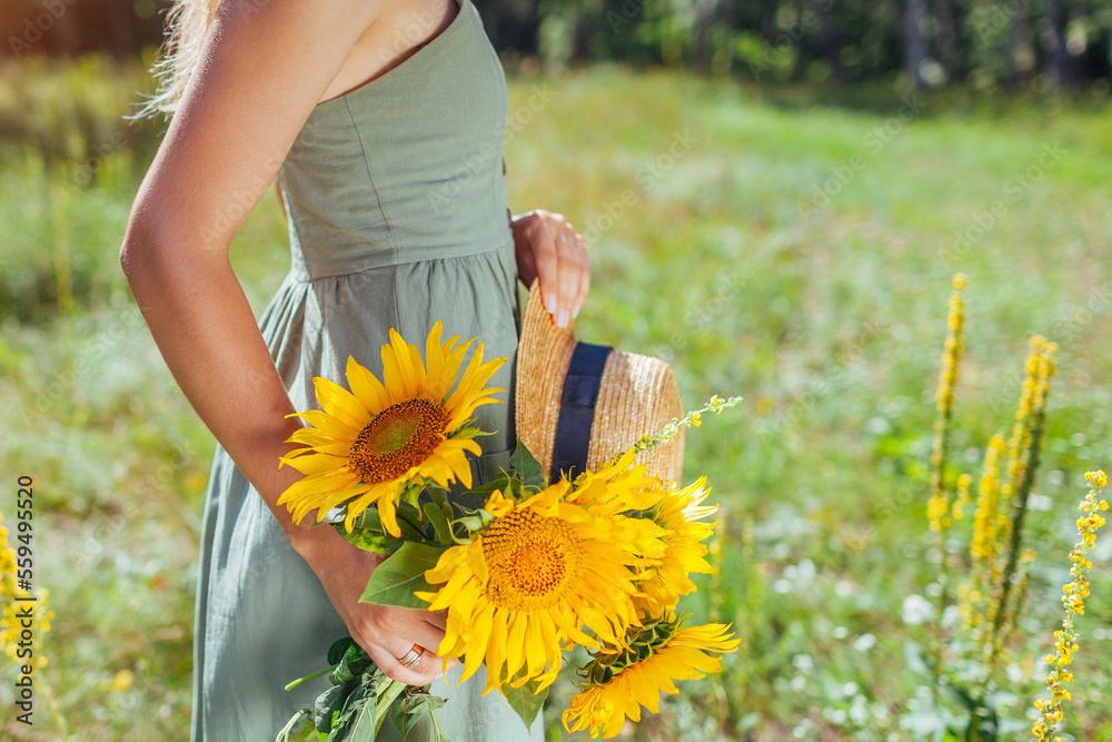 Close up of summer female accessory and clothes. Woman holding straw hat with bouquet of sunflowers outdoors