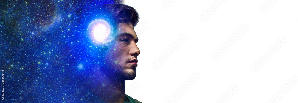 Silhouette of man with galaxy as brain isolated on white background. Universe is within us, galaxy and stars is a symbol of human thinking. Elements of this image furnished by NASA.