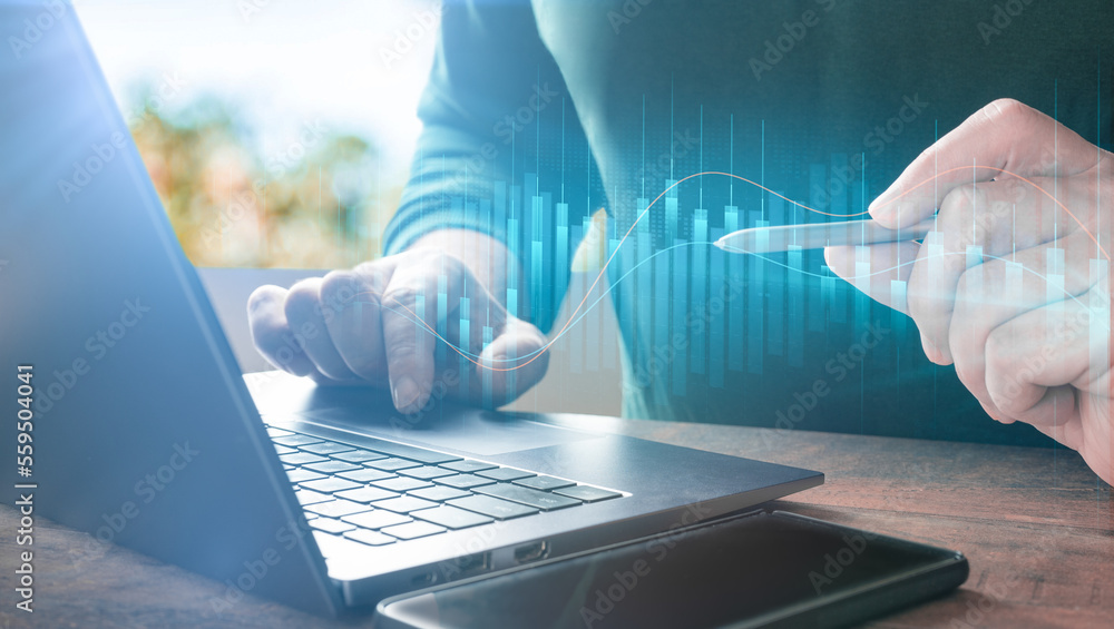 Financial report data of business operations as Fintech concept. Double exposure of businessman hand working with laptop. Analyze market stock