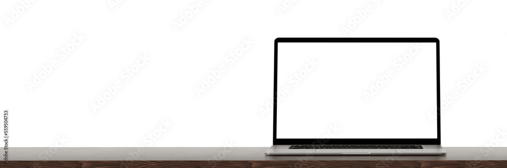Laptop blank screen mockup on wooden table. wide web banner. Front view. copy space. 3D rendering