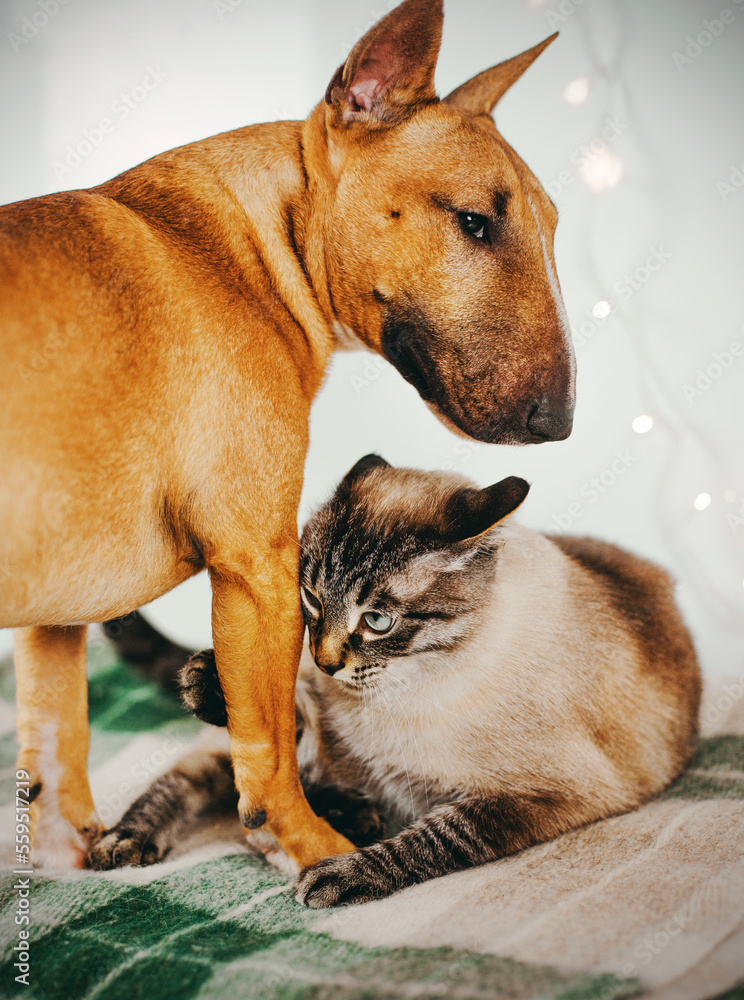 Two cute pets - a ginger bull terrier and a tabby Thai cat play together on a green plaid at home. Cat and dog are friends.