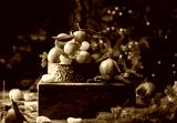 Christmas tangerines in metal box with christmas decorations on dark background. Christmas concept