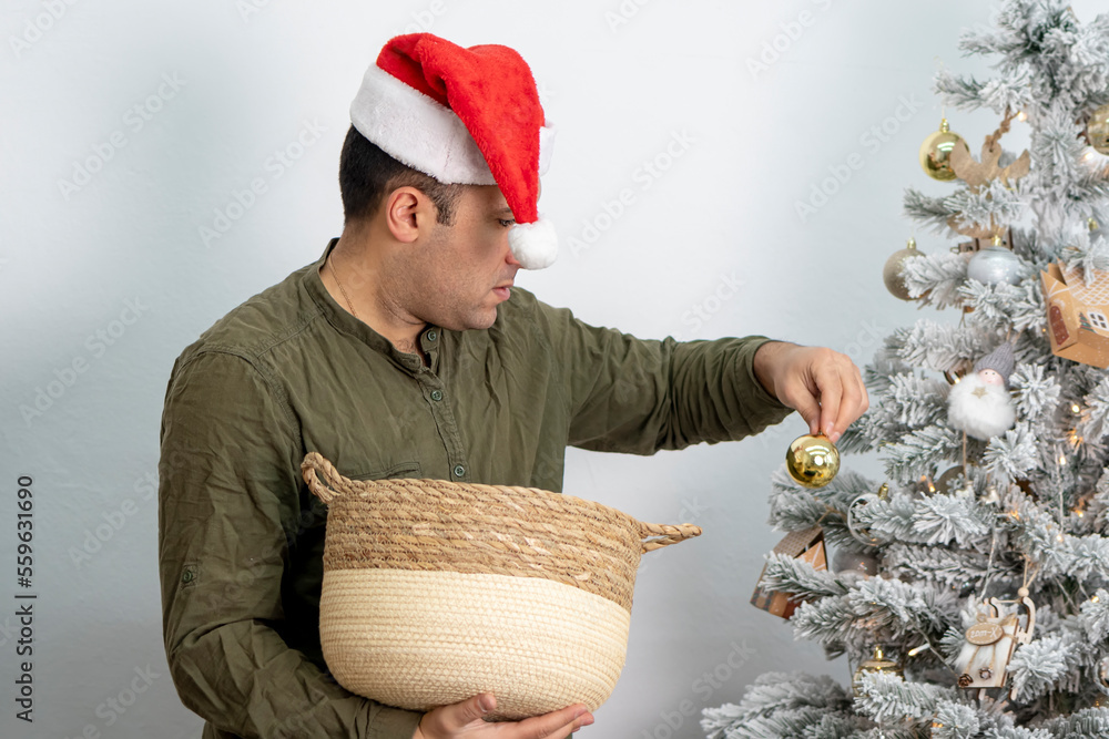 A joyful man of 30-35 years of oriental appearance in a red hat hangs toys from a wooden basket on the Christmas tree.
