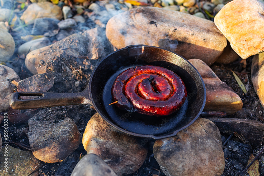 Sausage on the pan over an open fire. Preparing food in nature.