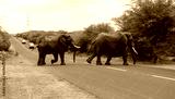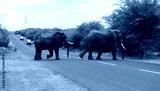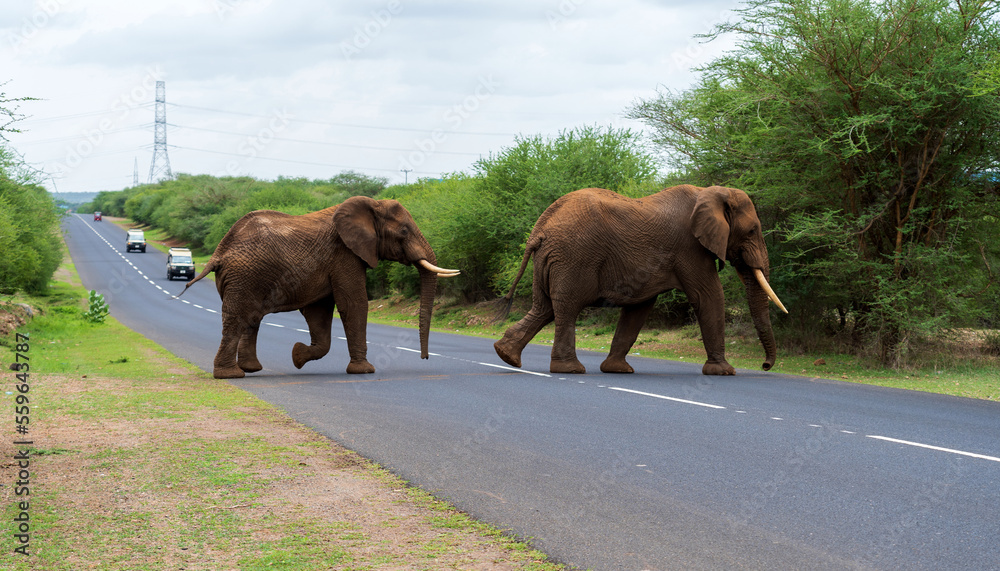 Two Elephants crossing a highway in Tanzania with vehicles in background