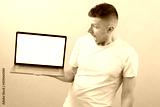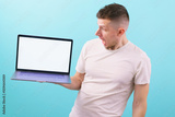 An amazed man holding a laptop with an empty blank screen and looking at it with an open mouth on blue background. Laptop. Look. Online. Person. Confused. Excited. Internet. Mouth. Shock. Job. Failure