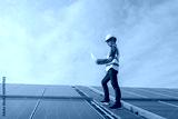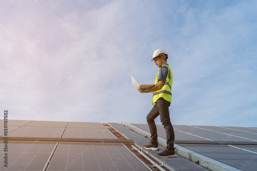 Engineers wearing a uniform walking on roof inspect and check solar cell panel, solar cell is smart ecology energy sunlight alternative power factory concept.