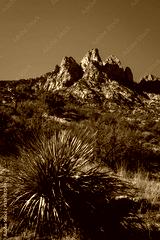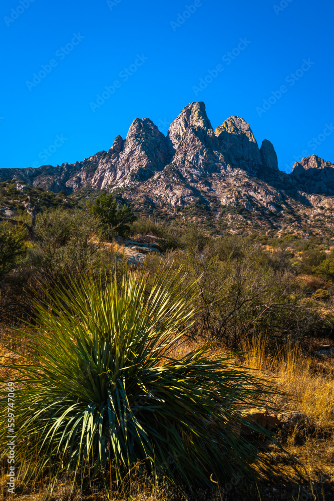 Organ Mountains, Desert Peaks National Monument in Las Cruces, Doña Ana County, New Mexico, Southwestern USA, Yucca and wilderness plants in the desert mountain valley