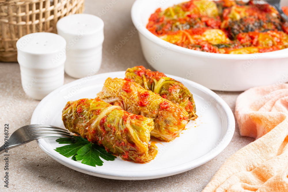 Meal with stuffed savoy cabbage with rice in a tomato sauce.