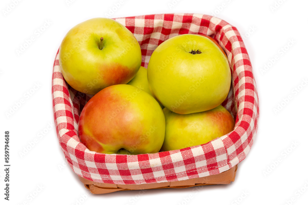 Green and red apples in a wicker wooden basket lie on a checkered cloth napkin., white background, isolate, top view,