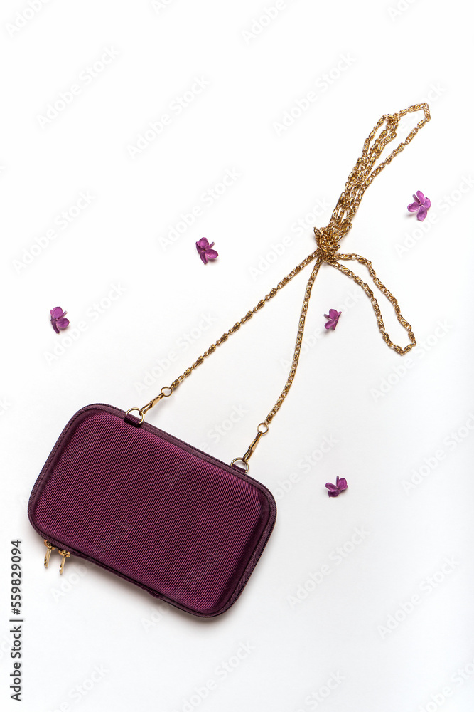 Purple female handbag with chain with fresh lilac flowers on white background. Personal luxury accessory, beauty and fashion concept. Flat lay, top view, copy space