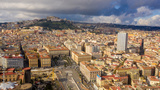Aerial view of Vomero hill and Castel Sant' Elmo from the historic center of Naples, Italy. In foreground there is Piazza Municipio, a large square of the city.