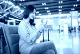 Happy asian tourist woman passenger using mobile smartphone with suitcase traveling between waits for flight in Airport Terminal, Browse Internet, flight check in, Tourist journey trip concept