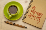 use your money to buy time - inspirational advice, handwriting in a notebook, finance and lifestyle concept