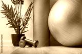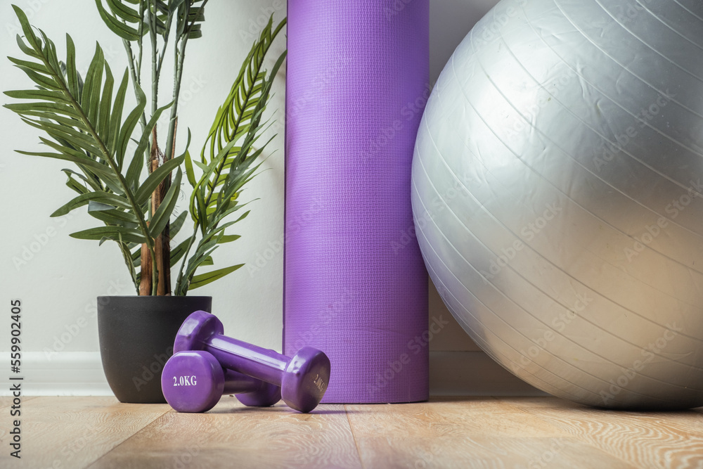 Light and heavy steel dumbbells, fitness ball and other sports equipment on the wooden floor in the gym. Fitness gear in the home interior. Training at home concept