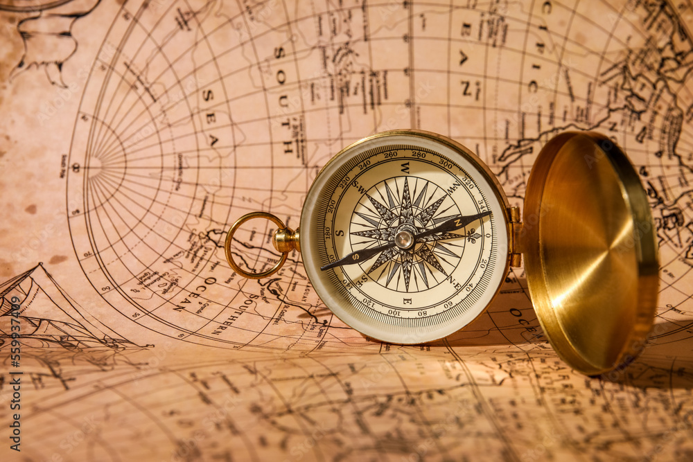 Golden compass on world map, closeup